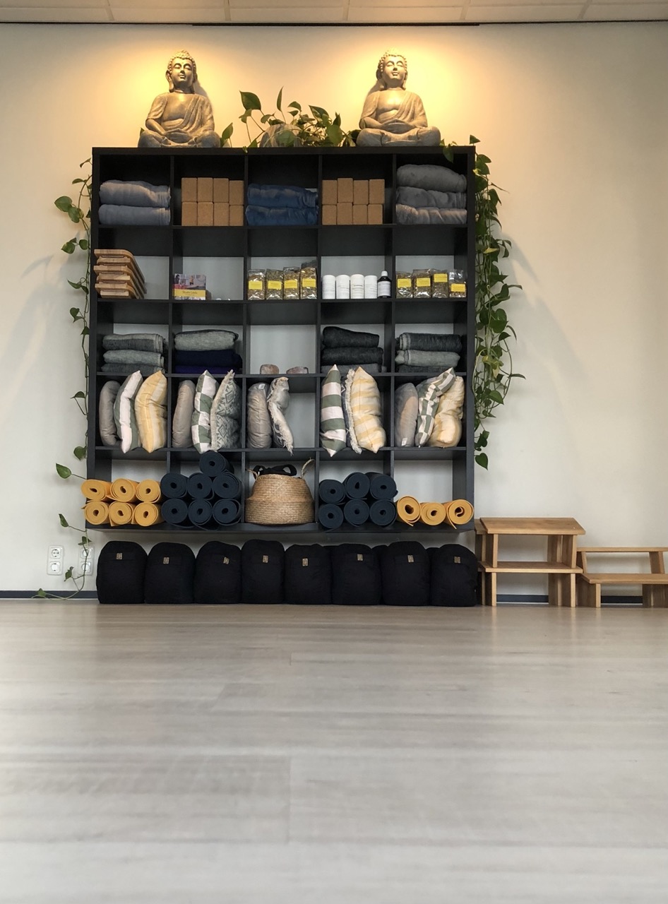 De ingang van de yogastudio is tevens de ingang van de Sportschool Quantum Fit. Je loopt door de sportschool, langs de balie, naar de koffietafel. Links daarvan vind je een gang met daarin de kleedkamers en toilletten. Daarachter vind je de yogastudio. Je kunt je omkleden in de kleedkamers, maar mag ook je spullen en schoenen in de lockers bij de studio plaatsen.